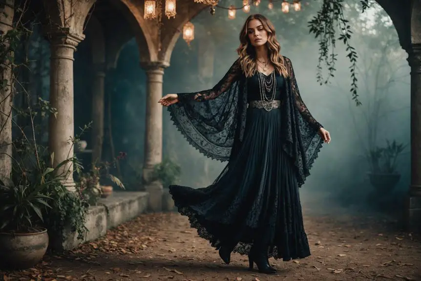 To truly embody Stevie Nicks' iconic style, you'll want to focus on key fashion elements that define her look. Central to Nicks' style is the flowing black dress, often accompanied by ethereal layers like shawls and capes that create a dramatic silhouette.