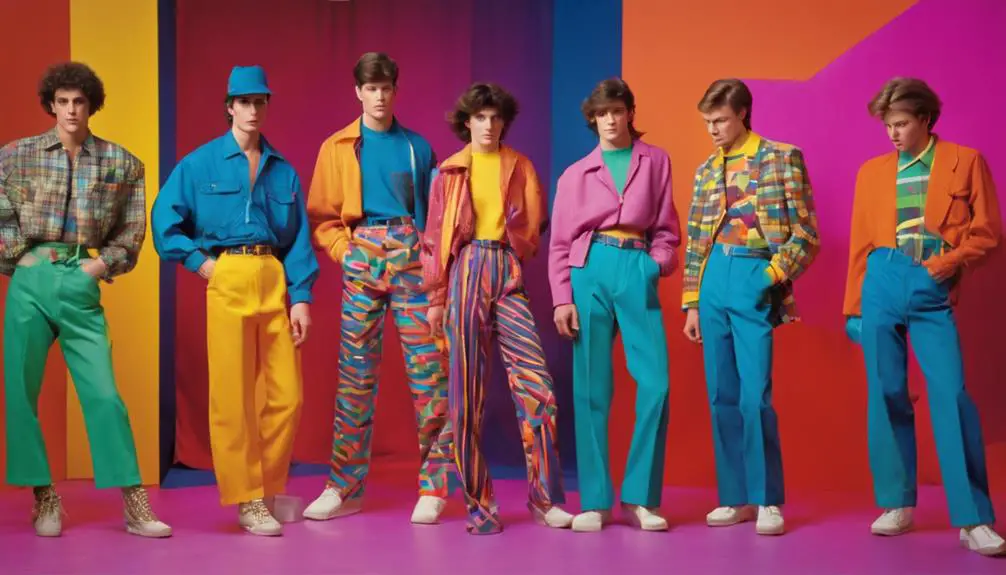 In the 1980s, men's trousers really stood out, marking a significant shift in fashion that embraced boldness and individuality. You'd notice high-waisted designs and wide-leg silhouettes that defined the era's daring style. Pleated trousers, often made from polyester or corduroy, became a staple in both casual and formal wardrobes, blending comfort with a touch of sophistication.
